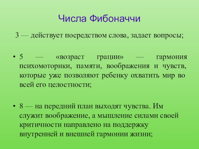 Числа Фибоначчи3 — действует посредством слова, задает вопросы; 5 — «возраст грации» — гармония психомоторики, памяти, воображения