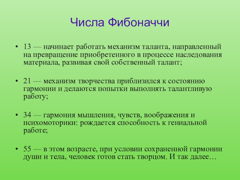 Числа Фибоначчи13 — начинает работать механизм таланта, направленный на превращение приобретенного в процессе наследования материала, развивая свой