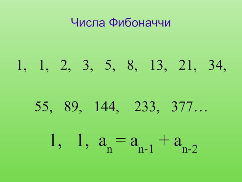 Числа Фибоначчи1,  1,  2,  3,  5,  8,  13,  21,