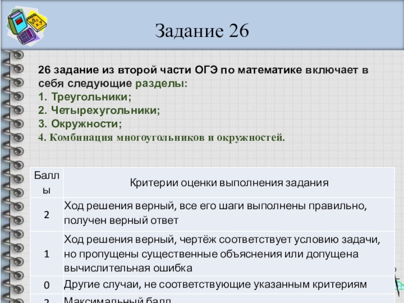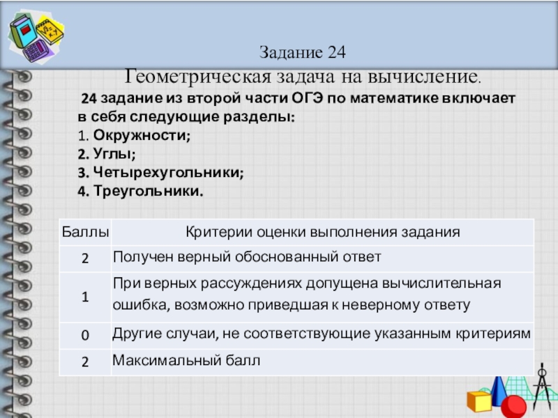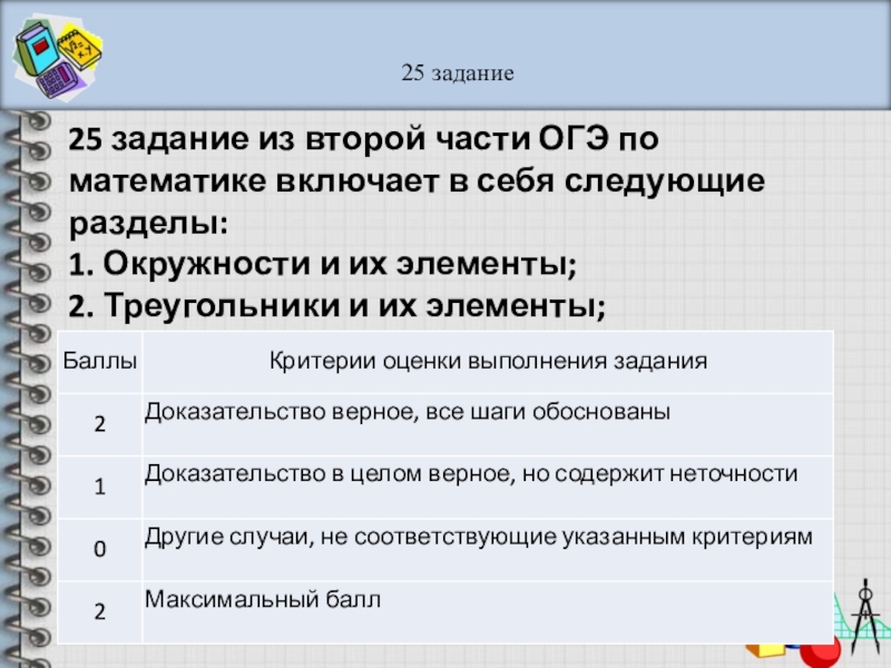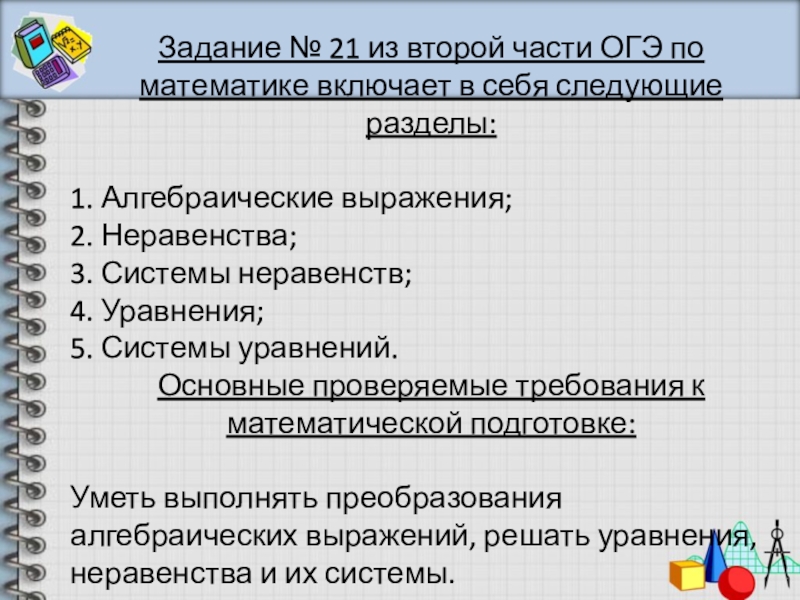 Слайд 2Задание № 21 из второй части ОГЭ по математике включает в себя
