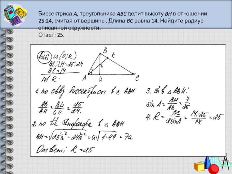 Слайд 45Биссектриса A, треугольника ABC делит высоту BH в отношении 25:24, считая