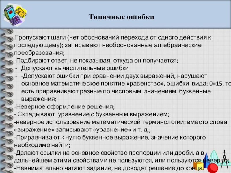 -неверное использование математической терминологии: вместо слова «выражение» записывают «уравнение» и т. д.;