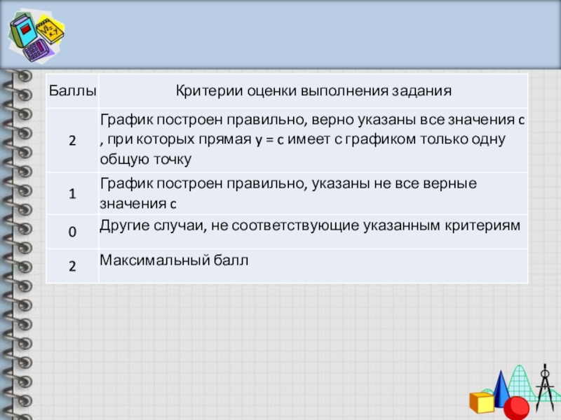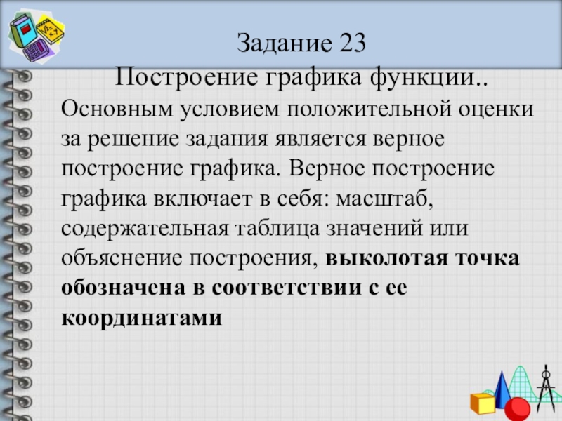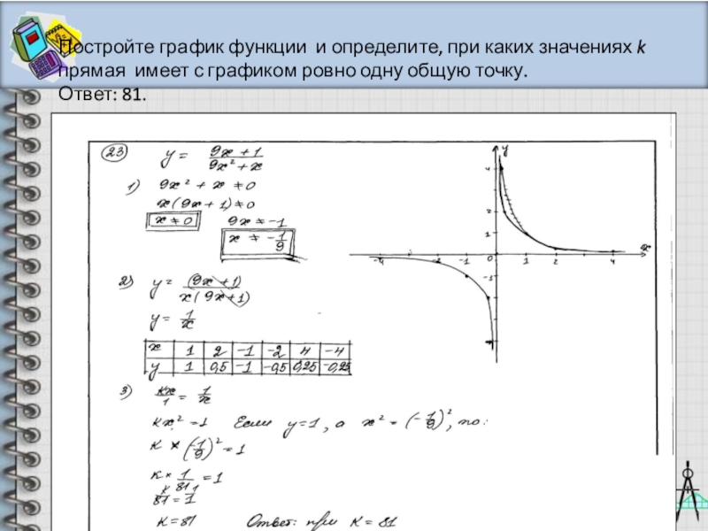 верное построение графика. Верное построение графика включает в себя: масштаб, содержательная таблица значений или объяснение построения, выколотая точка обозначена в соответствии с ее координатами