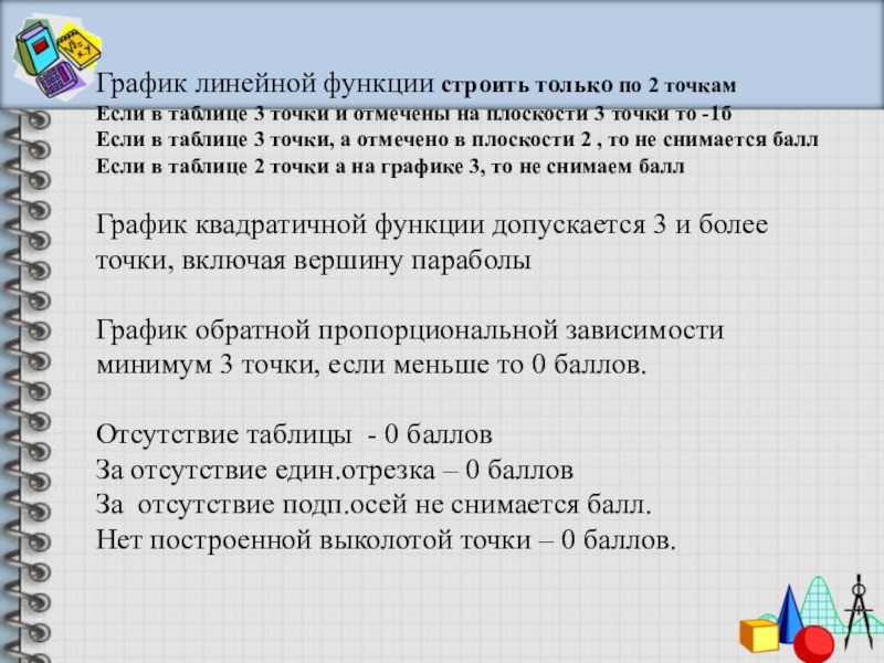 Построение части графика функции, не являющейся линейной, по двум точкам и наоборот, построение части графика линейной функции по трем и более точкам;