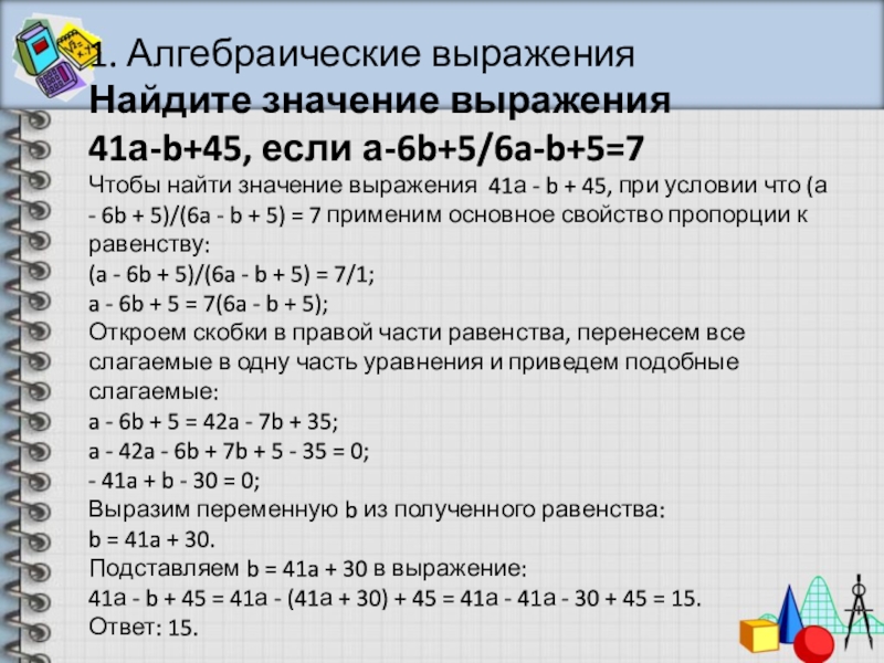 выражения 41а - b + 45, при условии что (а - 6b + 5)/(6a - b + 5) = 7 применим основное свойство пропорции к равенству: