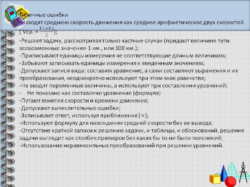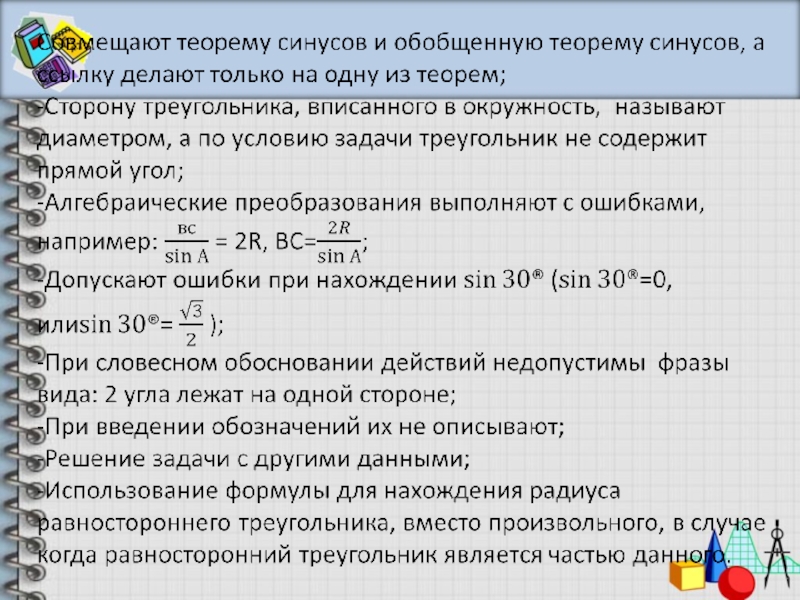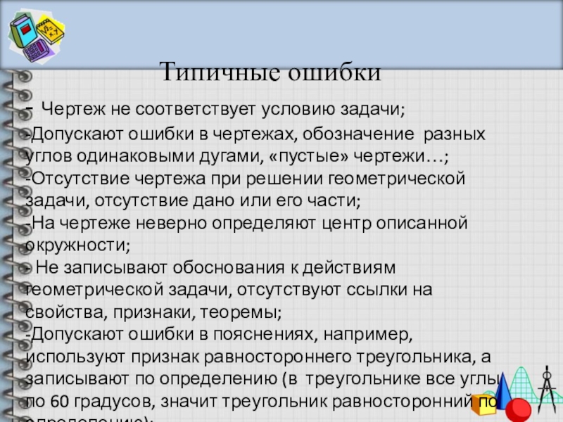 - Не записывают обоснования к действиям геометрической задачи, отсутствуют ссылки на свойства, признаки, теоремы;