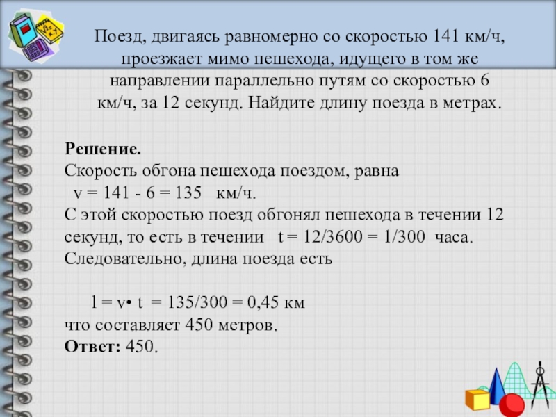 С этой скоростью поезд обгонял пешехода в течении 12 секунд, то есть в течении t = 12/3600 = 1/300 часа. Следовательно, длина поезда есть
