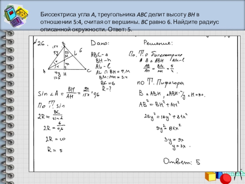 Слайд 44Биссектриса угла A, треугольника ABC делит высоту BH в отношении 5:4,