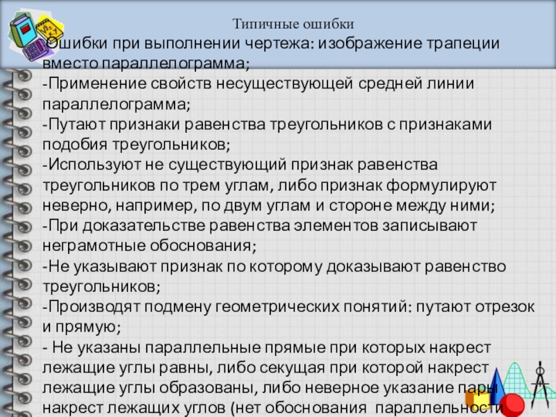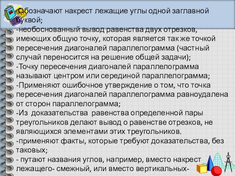 - путают названия углов, например, вместо накрест лежащего- смежный, или вместо вертикальных- односторонние…;