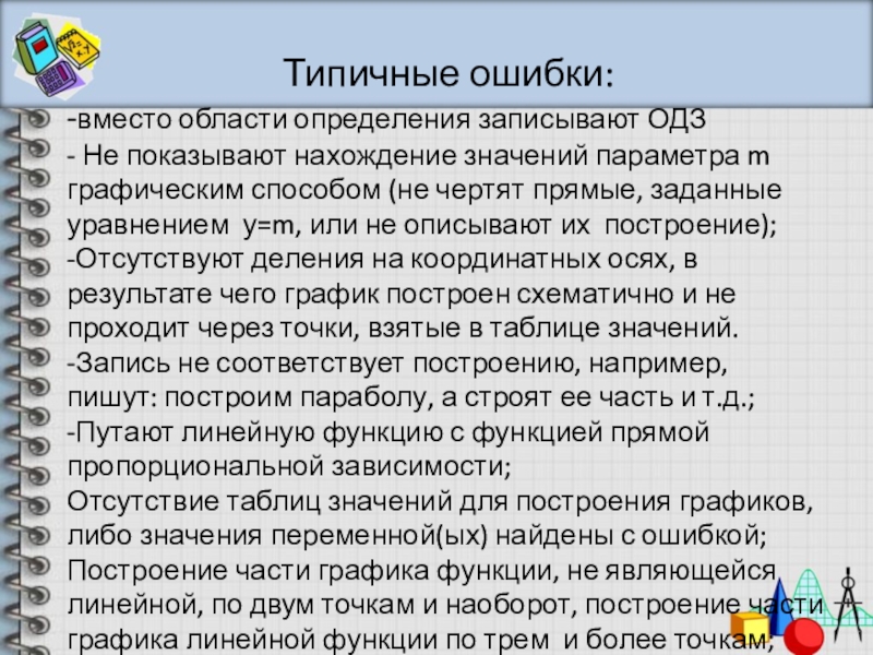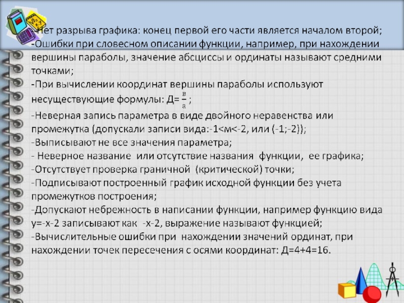 -Запись не соответствует построению, например, пишут: построим параболу, а строят ее часть и т.д.;