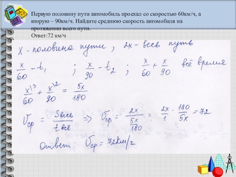 Слайд 21Первую половину пути автомобиль проехал со скоростью 60км/ч, а вторую –