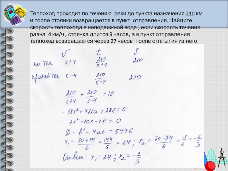 Слайд 22Теплоход проходит по течению реки до пункта назначения 210 км и