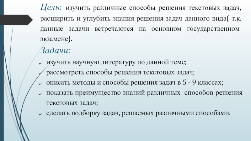 Слайд 4Цель: изучить различные способы решения текстовых задач, расширить и углубить знания