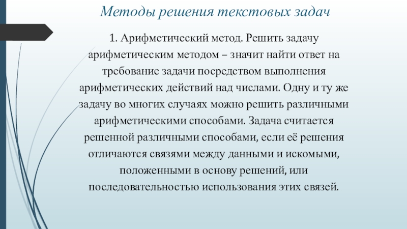 значит найти ответ на требование задачи посредством выполнения арифметических действий над числами. Одну и ту же задачу во многих случаях можно решить различными арифметическими способами. Задача считается решенной различными способами, если её решения отличаются связями между данными и искомыми, положенными в основу решений, или последовательностью использования этих связей.