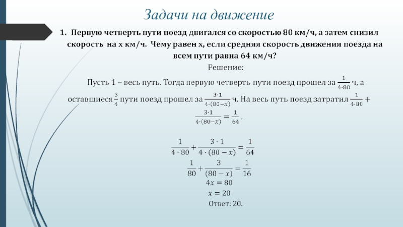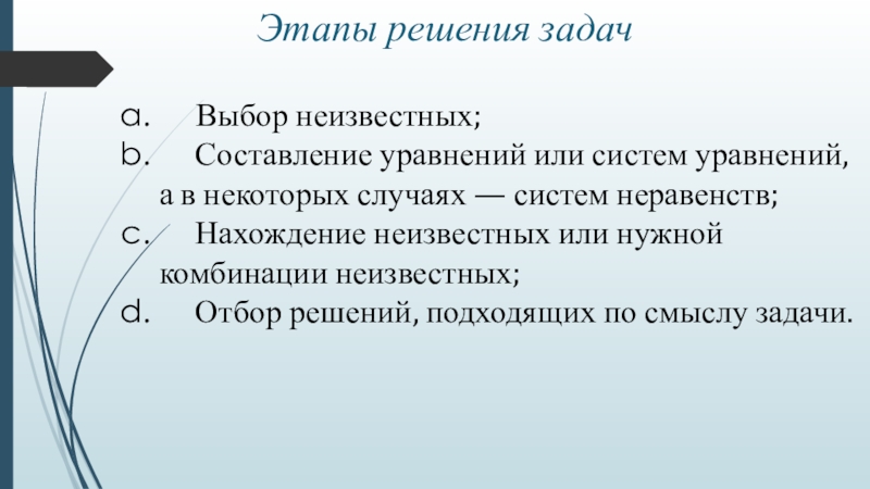 ответ на требование задачи, составив и решив уравнение или систему уравнений (или неравенств). Одну и ту же задачу можно также решить различными алгебраическими способами. Задача считается решенной различными способами, если для её решения составлены различные уравнения или системы уравнений (неравенств), в основе составления которых лежат различные соотношения между данными и искомыми.