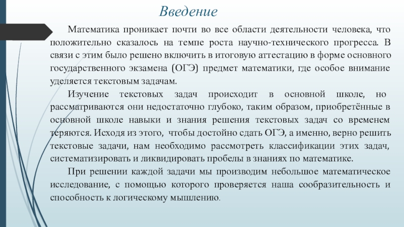 на темпе роста научно-технического прогресса. В связи с этим было решено включить в итоговую аттестацию в форме основного государственного экзамена (ОГЭ) предмет математики, где особое внимание уделяется текстовым задачам.