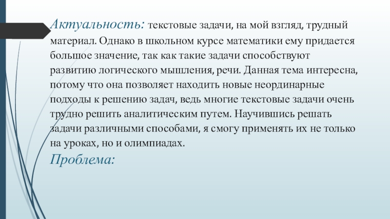 Слайд 3Актуальность: текстовые задачи, на мой взгляд, трудный материал. Однако в школьном