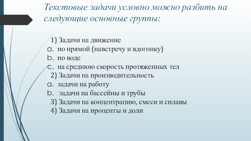 Текстовые задачи условно можно разбить на следующие основные группы: