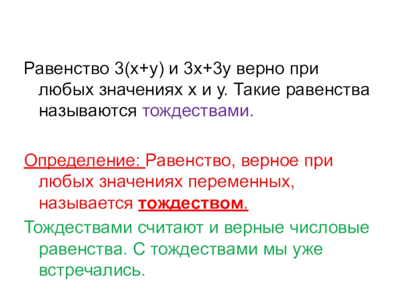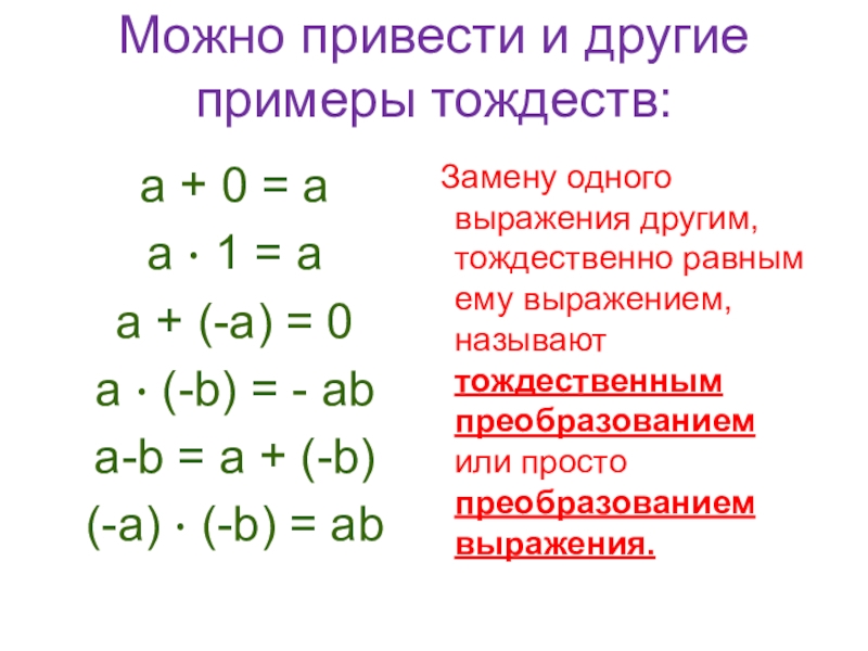 Замену одного выражения другим, тождественно равным ему выражением, называют тождественным преобразованием или просто преобразованием выражения.