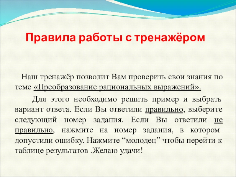 Правила работы с тренажёром   Наш тренажёр позволит Вам проверить свои знания по теме «Преобразование рациональных