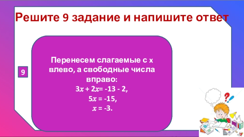 Перенесем слагаемые с x влево, а свободные числа вправо: