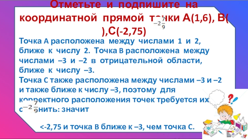 Точка C также расположена между числами –3 и –2 и также ближе к числу –3, поэтому для корректного расположения точек требуется их сравнить: значит