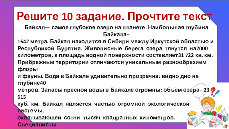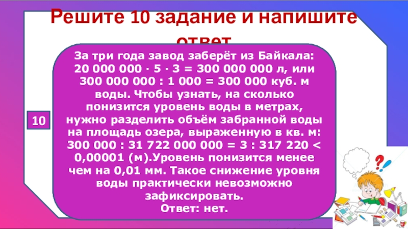 За три года завод заберёт из Байкала: 20 000 000 · 5 · 3 = 300 000 000 л, или 300 000 000 : 1 000 = 300 000 куб. м воды. Чтобы узнать, на сколько понизится уровень воды в метрах, нужно разделить объём забранной воды на площадь озера, выраженную в кв. м: