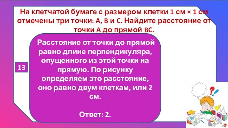 Расстояние от точки до прямой равно длине перпендикуляра, опущенного из этой точки на прямую. По рисунку определяем это расстояние, оно равно двум клеткам, или 2 см.