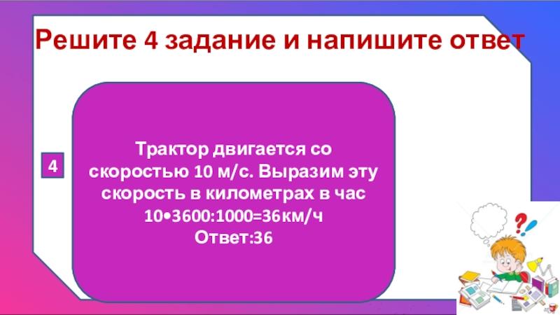 Трактор двигается со скоростью 10 м/с. Выразим эту скорость в километрах в час 10•3600:1000=36км/ч