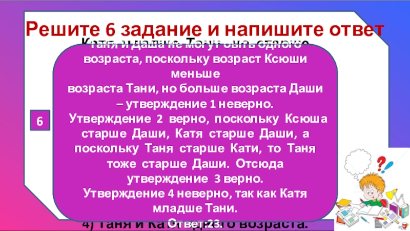 поскольку Таня старше Кати, то Таня тоже старше Даши. Отсюда утверждение 3 верно.