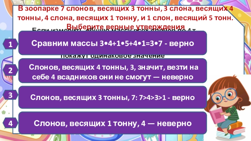 Слонов, весящих 3 тонны, 7: 7>4>3>1 - верно