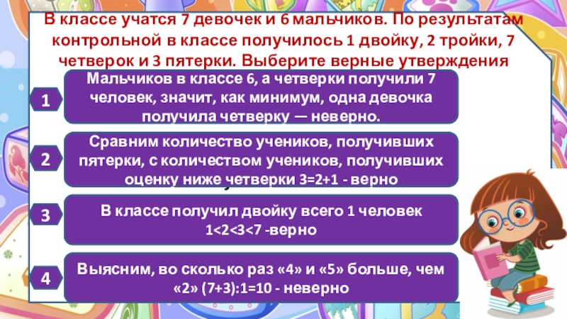Мальчиков в классе 6, а четверки получили 7 человек, значит, как минимум, одна девочка получила четверку — неверно.