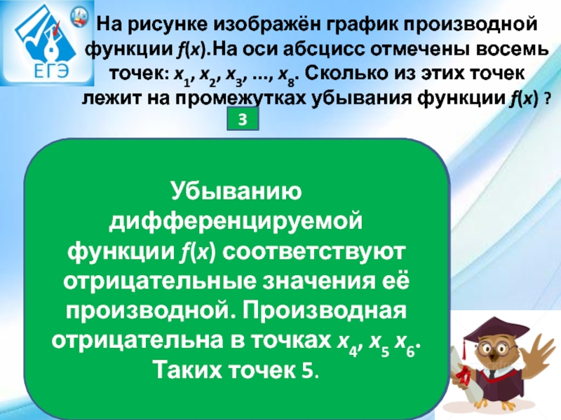 Убыванию дифференцируемой функции f(x) соответствуют отрицательные значения её производной. Производная отрицательна в точках x4, x5 x6. Таких точек 5.