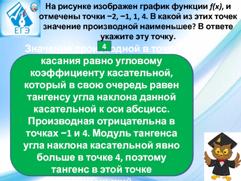 На рисунке изображен график функции f(x), и отмечены точки −2, −1, 1, 4. В какой из этих точек значение производной наименьшее? В ответе укажите эту точку.