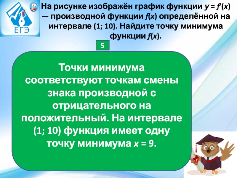 Точки минимума соответствуют точкам смены знака производной с отрицательного на положительный. На интервале (1; 10) функция имеет одну точку минимума x = 9.