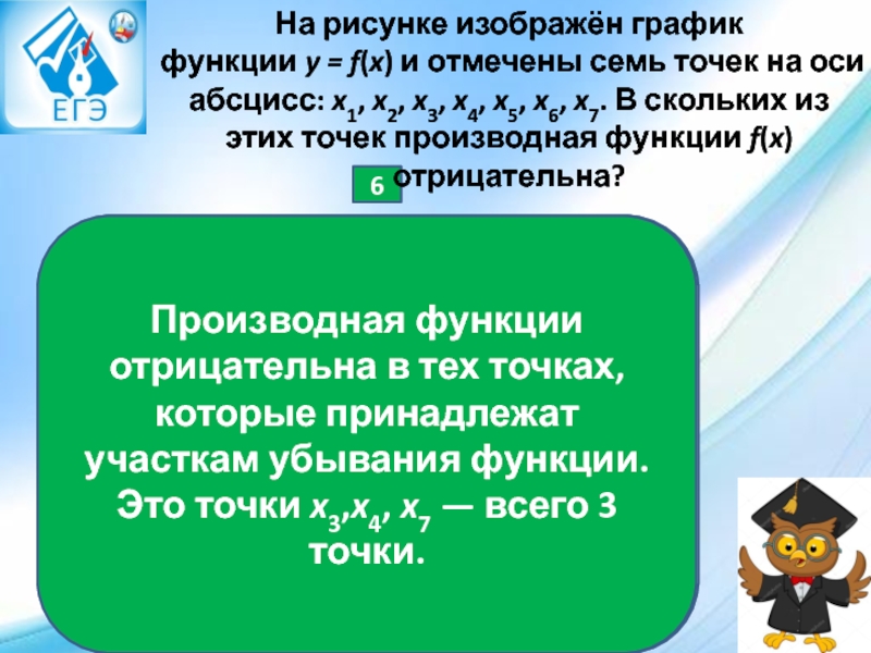 На рисунке изображён график функции y = f(x) и отмечены семь точек на оси абсцисс: x1, x2, x3, x4, x5, x6, x7. В скольких из этих точек производная функции f(x) отрицательна?