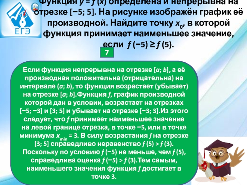 Если функция непрерывна на отрезке [a; b], а её производная положительна (отрицательна) на интервале (a; b), то функция возрастает (убывает) на отрезке [a; b].Функция f, график производной которой дан в условии, возрастает на отрезках [−5; −3] и [3; 5] и убывает на отрезке [−3; 3].Из этого следует, что f принимает наименьшее значение на левой границе отрезка, в точке −5, или в точке минимума хmin = 3. В силу возрастания f на отрезке [3; 5] справедливо неравенство f (5) > f (3). Поскольку по условию f (−5) не меньше, чем f (5), справедлива оценка f (−5) > f (3).Тем самым, наименьшего значения функция f достигает в точке 3.