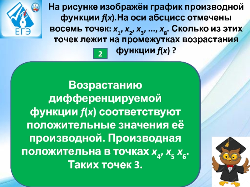 На рисунке изображён график производной функции f(x).На оси абсцисс отмечены восемь точек: x1, x2, x3, ..., x8. Сколько из этих точек лежит на промежутках возрастания функции f(x) ?