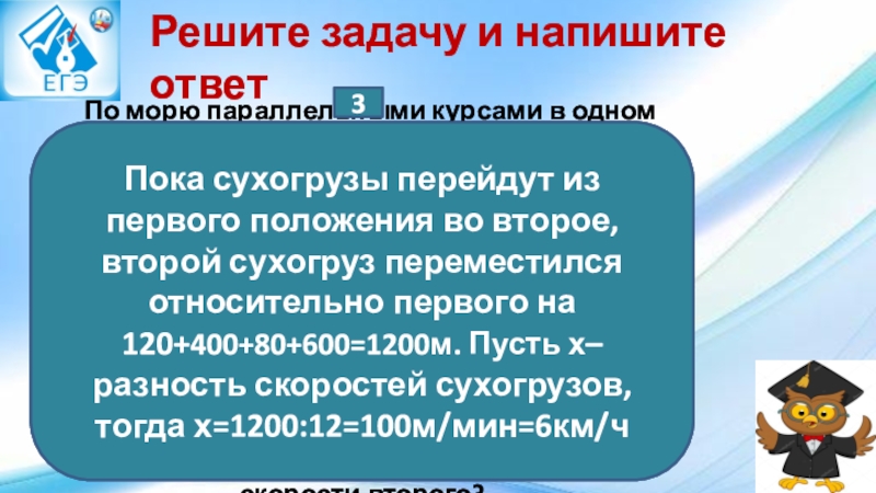 Пока сухогрузы перейдут из первого положения во второе, второй сухогруз переместился относительно первого на 120+400+80+600=1200м. Пусть х– разность скоростей сухогрузов, тогда х=1200:12=100м/мин=6км/ч