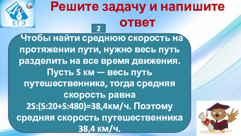 Чтобы найти среднюю скорость на протяжении пути, нужно весь путь разделить на все время движения. Пусть S км — весь путь путешественника, тогда средняя скорость равна 2S:(S:20+S:480)=38,4км/ч. Поэтому средняя скорость путешественника 38,4 км/ч.