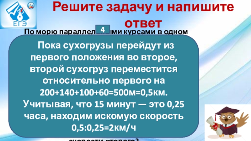Пока сухогрузы перейдут из первого положения во второе, второй сухогруз переместится относительно первого на 200+140+100+60=500м=0,5км. Учитывая, что 15 минут — это 0,25 часа, находим искомую скорость 0,5:0,25=2км/ч