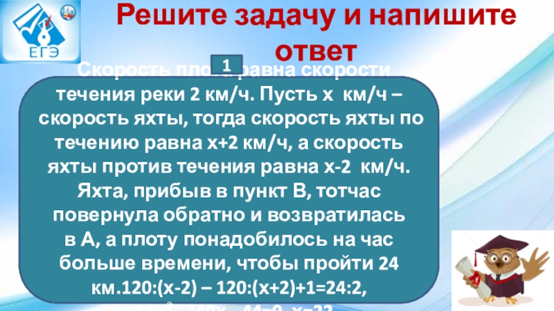 Скорость плота равна скорости течения реки 2 км/ч. Пусть х км/ч – скорость яхты, тогда скорость яхты по течению равна х+2 км/ч, а скорость яхты против течения равна х-2 км/ч. Яхта, прибыв в пункт В, тотчас повернула обратно и возвратилась в А, а плоту понадобилось на час больше времени, чтобы пройти 24 км.120:(х-2) – 120:(х+2)+1=24:2,