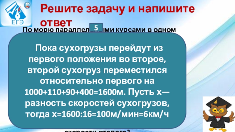 Пока сухогрузы перейдут из первого положения во второе, второй сухогруз переместился относительно первого на 1000+110+90+400=1600м. Пусть х— разность скоростей сухогрузов, тогда х=1600:16=100м/мин=6км/ч