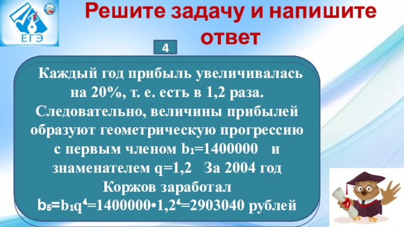 Каждый год прибыль увеличивалась на 20%, т. е. есть в 1,2 раза. Следовательно, величины прибылей образуют геометрическую прогрессию с первым членом b₁=1400000 и знаменателем q=1,2 За 2004 год Коржов заработал b₅=b₁q⁴=1400000•1,2⁴=2903040 рублей