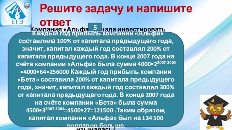 Каждый год прибыль компании «Альфа» составляла 100% от капитала предыдущего года, значит, капитал каждый год составлял 200% от капитала предыдущего года. В конце 2007 года на счёте компании «Альфа» была сумма 4000•22007-2000 =4000•64=256000 Каждый год прибыль компании «Бета» составила 200% от капитала предыдущего года, значит, капитал каждый год составлял 300% от капитала предыдущего года. В конце 2007 года на счёте компании «Бета» была сумма 4500•32007-2004=4500•27=121500 .Таким образом, капитал компании «Альфа» был на 134 500 долларов больше.