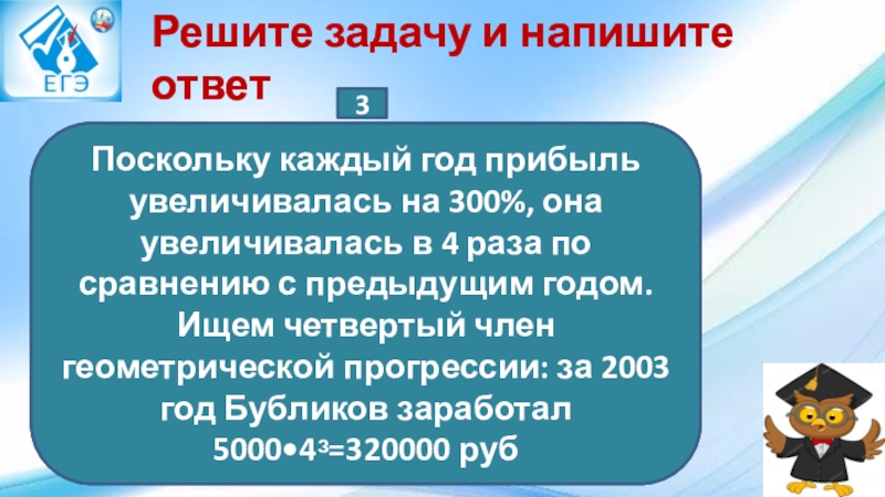 Поскольку каждый год прибыль увеличивалась на 300%, она увеличивалась в 4 раза по сравнению с предыдущим годом. Ищем четвертый член геометрической прогрессии: за 2003 год Бубликов заработал 5000•4ᵌ=320000 руб