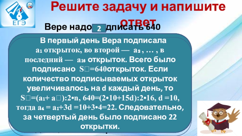 В первый день Вера подписала a₁ открыток, во второй — а₂ , … , в последний — а₁₆ открыток. Всего было подписано Sₙ=640открыток. Если количество подписываемых открыток увеличивалось на d каждый день, то Sₙ=(a₁+ аₙ):2•n, 640=(2•10+15d):2•16, d =10, тогда а₄ = a₁+3d =10+3•4=22. Следовательно, за четвертый день было подписано 22 открытки.