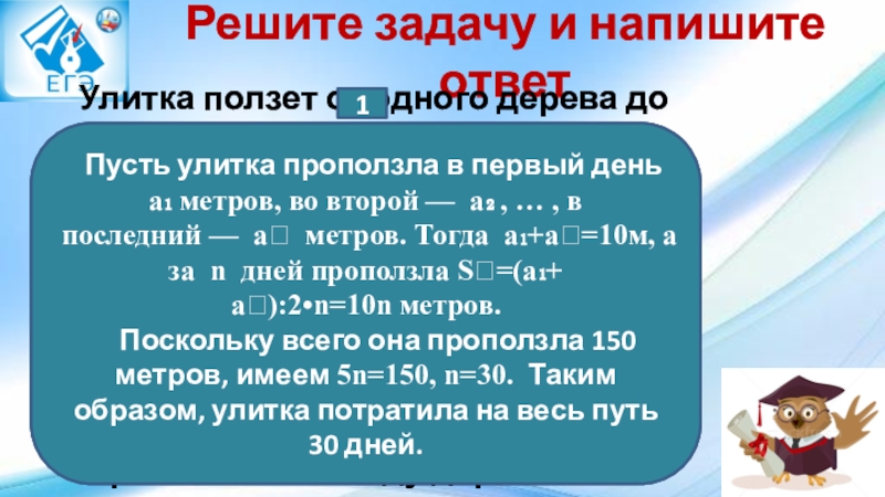 Поскольку всего она проползла 150 метров, имеем 5n=150, n=30. Таким образом, улитка потратила на весь путь 30 дней.