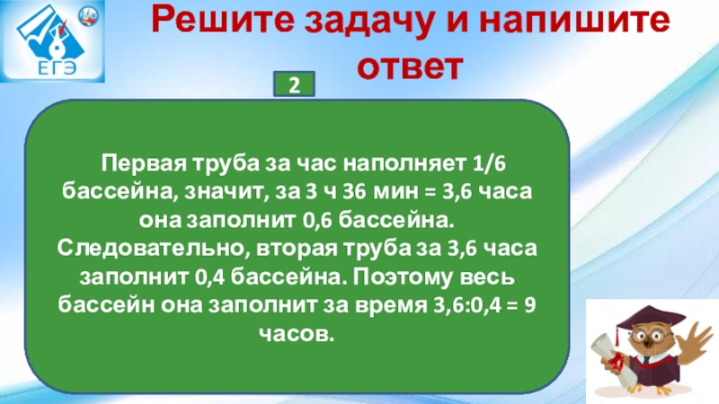 Первая труба за час наполняет 1/6 бассейна, значит, за 3 ч 36 мин = 3,6 часа она заполнит 0,6 бассейна. Следовательно, вторая труба за 3,6 часа заполнит 0,4 бассейна. Поэтому весь бассейн она заполнит за время 3,6:0,4 = 9 часов.