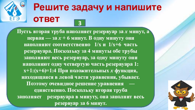 Пусть вторая труба наполняет резервуар за x минут, а первая — за x + 6 минут. В одну минуту они наполняют соответственно 1/х и 1/х+6 часть резервуара. Поскольку за 4 минуты обе трубы заполняют весь резервуар, за одну минуту они наполняют одну четвертую часть резервуара 1:х+1:(х+6)=1:4 При положительных x функция, находящаяся в левой части уравнения, убывает. Поэтому очевидное решение уравнения — единственно. Поскольку вторая труба заполняет резервуара в минуту, она заполнит весь резервуар за 6 минут.
